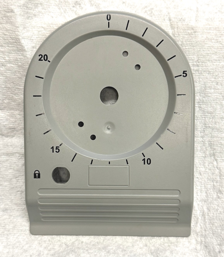 Gray plastic bezel with marks for a 20 minute eletro-mechanical timer. Includes hole for Control Key switch.